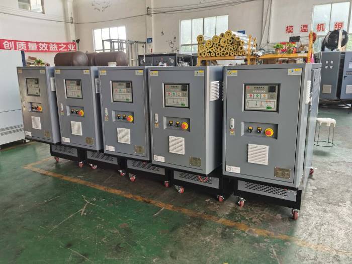 擠出模溫機和擠出分段控溫模溫機擠出機的規格不同,其控溫區段的數量也會不一樣,可根據不同的擠出機,采取統一控溫或分段控溫,物料擠出前,模溫機需要將各被控區段的溫度升高至預設值,在物料擠出時,由于機械能被大量轉化為熱能,模溫機又需要通過熱交換來將這些熱量帶走,達到溫度恒定的作用。所以模溫機在擠出設備上的應用可以看作是一個擠出機主機啟動前的預熱升溫和主機運行過程中維持恒溫的過程。擠出分段控溫模溫機案例:客戶的擠出機每一個工藝段要求不同的溫度控制,推薦客戶使用雙回路模溫機或者多機一體模溫機來控制溫度,可以對擠出機設備中的各個工藝段同時進行獨立的加熱和冷卻,從而達到一機多用的目的。如果對每一個工藝段使用一臺加熱設備進行單獨的溫度控制,也能達到其技術要求,但是費用高占地面積大。