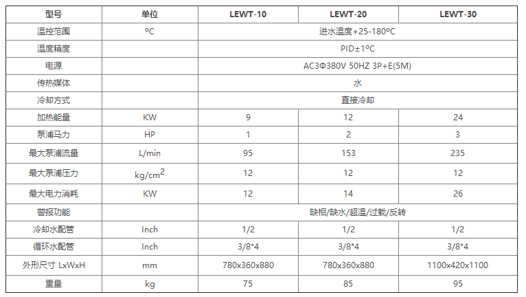 高溫水式模溫機選擇水作為傳熱介質(zhì),只需要連接自來水即可,使用方便且無污染.按使用溫度分為120度水溫機,150度水溫機和180度水溫機三大類型.實際控溫溫度大于180℃時,建議采用油溫機.高溫水式模溫機的選配需要根據(jù)生產(chǎn)工藝來進行確認,選擇合適的滿足其工藝需求.