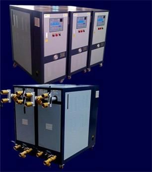 油加熱器控溫機(jī)實(shí)質(zhì)上是指利用導(dǎo)熱油做為傳熱媒介來進(jìn)行加熱控溫的模溫機(jī).油加熱器控溫機(jī)自帶膨脹油箱,膨脹油箱有三大作用:補(bǔ)油、排氣及容納導(dǎo)熱油經(jīng)過高溫之后的膨脹系數(shù),在正常升溫過程中,油箱是不參與加熱過程的,油溫機(jī)在使用初期,導(dǎo)熱油經(jīng)膨脹油箱補(bǔ)充進(jìn)入管路系統(tǒng),經(jīng)高溫泵強(qiáng)制液相循環(huán),在需控溫的設(shè)備與機(jī)組系統(tǒng)之間循環(huán),導(dǎo)熱油從機(jī)組的發(fā)熱裝置出來后,溫度升高,進(jìn)入控溫設(shè)備后,熱量被吸收,再返回到系統(tǒng)的發(fā)熱管中繼續(xù)升溫,在此泵泵注入到需用熱設(shè)備中,周而復(fù)始,直至用熱設(shè)備達(dá)到設(shè)定溫度.