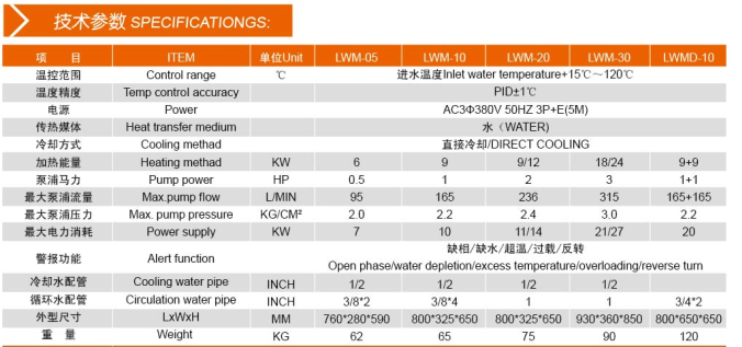 采用熱水循環泵,大流量高揚程.高性能板式熱交換器和高功率加熱器,實現快速升溫和降溫,自動補水系統,壓力過載自動泄壓系統.溫度控制表采用日本微電腦變組P.I.D控制,腦觸摸式控制,操作簡單易懂.可靠.電控箱與機身采用隔離式,隔熱效果佳,完會斷絕水氣,油氣熱量侵入,延長電器零件。獨特的加熱設計,升降溫速度快溫度穩定,適合不同溫控場所使用,效果明顯.及指示系統.管路設計采用不銹鋼無縫管,減少管阻及銹垢,避免漏水現象.