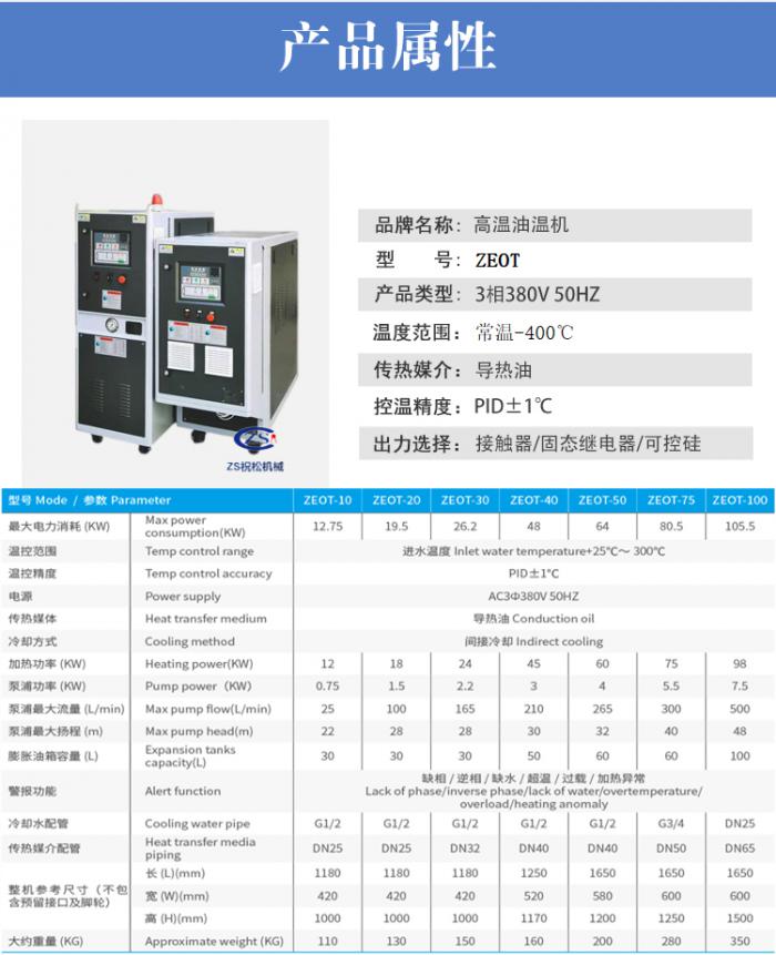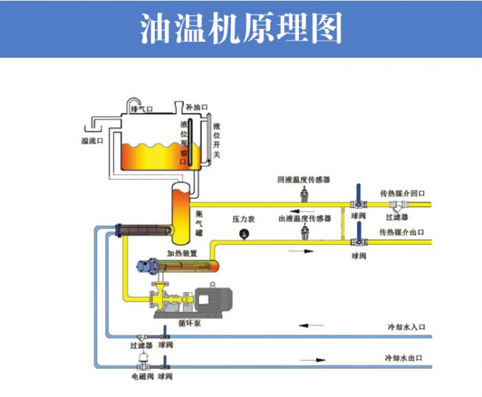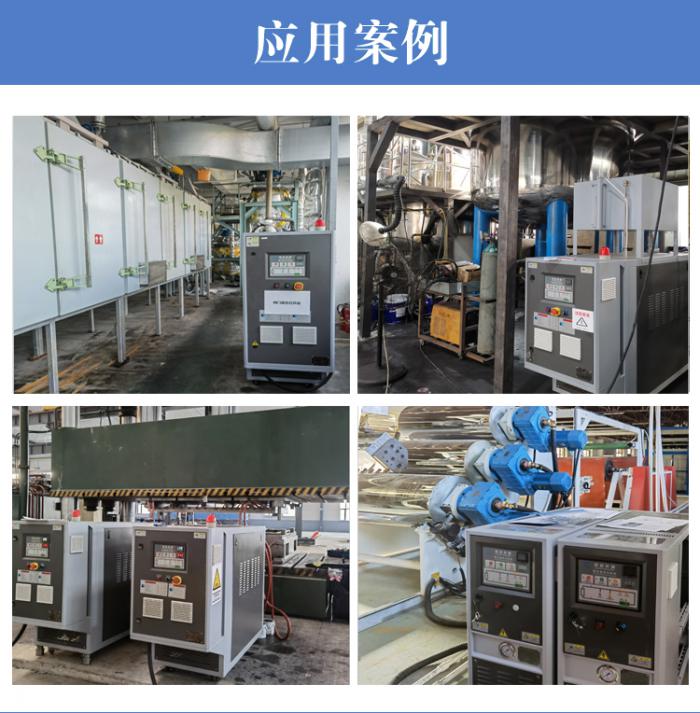 用于烘箱加熱,紡織處理烘箱,干燥烘箱加熱等行業。烘箱每段裝有散熱器,使用的導熱介質為導熱油。 導熱油經過散熱器并循環。由風機吹散熱器,加速熱傳遞,并使烘箱內的溫度均衡,從而得到所需要的溫度。油溫機用于烘箱加熱控溫和采暖,是用來幫助烘箱加熱、恒溫、控溫的模溫機/油溫機。加熱功率可供選擇,利用循環泵,強制導熱油進行液相循環,將熱量傳遞給用一個或多種用熱設備,經用熱設備卸載后,重新通過循環泵,回到加熱器,再吸收熱量,傳遞給用熱設備,如此周而復始,實現熱量的連續傳遞,使被加熱物體溫度升高,達到加熱的工藝要求。