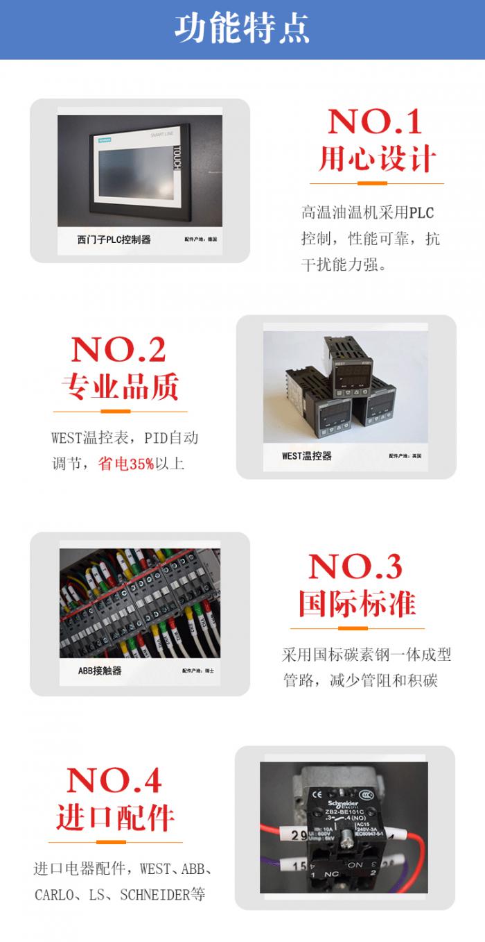 3.電器組件:所有電器元件均采用施耐德系列電器組件,故障率低,延長設備使用壽命.導熱油加熱器控制系統:微電腦控制,5路單片電路板,雙組PID,加熱冷卻自主運行.