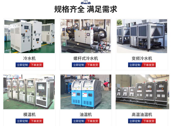祝松機(jī)械加熱設(shè)備: 模溫機(jī)-包括油溫機(jī)和水溫機(jī)兩大類型,主要用于加熱及恒溫,帶輔助冷卻系統(tǒng); 油溫機(jī)-包含200度油溫機(jī)、300度油溫機(jī)和350度油溫機(jī)以及400度高溫油溫機(jī)4種機(jī)型。水溫機(jī)-包含98度水溫機(jī)、120度水溫機(jī)、150度水溫機(jī)和180度水溫機(jī)4種機(jī)型,導(dǎo)熱油加熱器-利用導(dǎo)熱油的傳熱性能為需用熱設(shè)備提供熱源. 制冷設(shè)備: 冷水機(jī)-工業(yè)用冷水機(jī),俗稱冷凍機(jī),制冷機(jī),冰水機(jī),凍水機(jī),冷卻機(jī)等 冷熱一體機(jī)-冷熱一體機(jī)分為加熱部分和冷卻部分,二者通過系統(tǒng)設(shè)計(jì)合于一體.